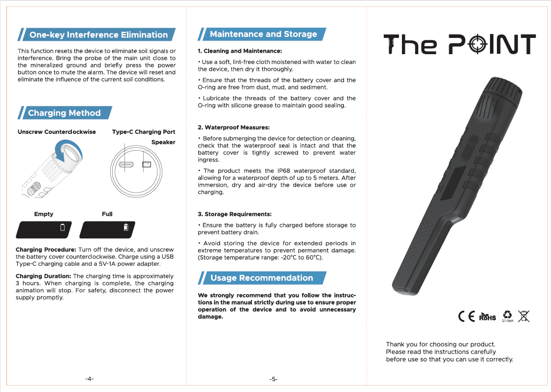 The Point Rechargeable Pinpointer! Our top-of-the-line product offers the same features and benefits as other pricier options, without sacrificing on quality. Never worry about a dead battery again with our rechargeable design, perfect for any outdoor adventure.