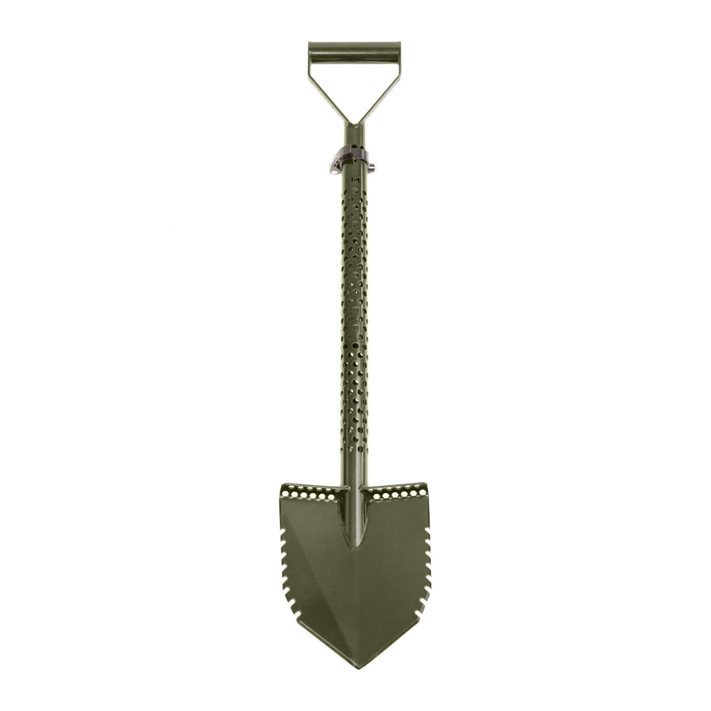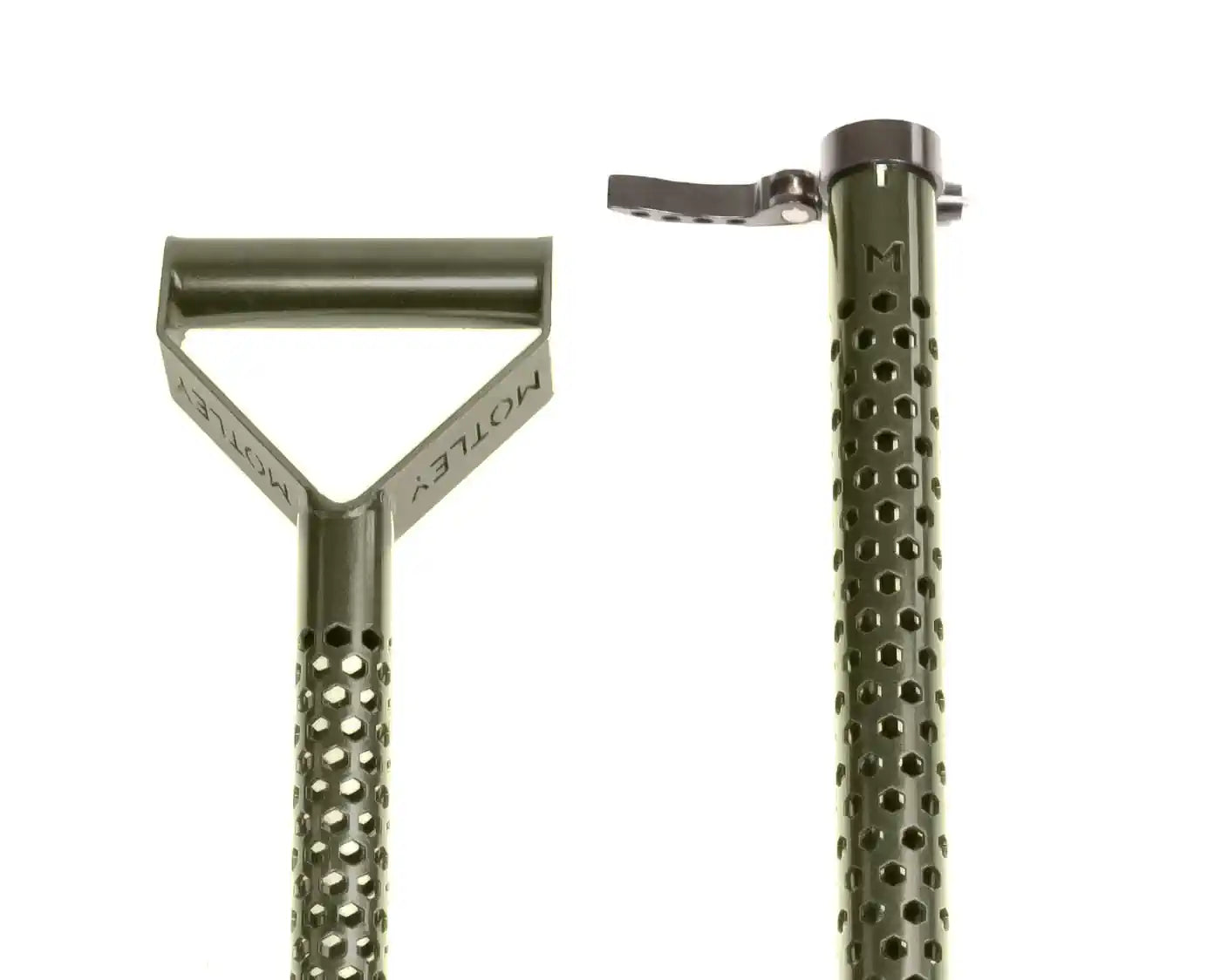 The blade of the shovel is cold-pressed and then heat treated which makes it stiff and extremely strong. We then added the Motley Easy Grip D-handle and finished it with a hexagon laser-cut design to reduce weight.